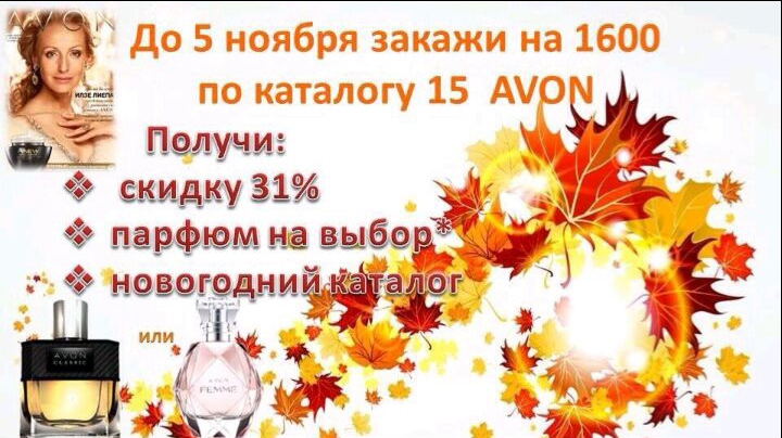 Закажи до 5 ноября 2015 года товары по каталогу Avon 15/2015 на сумму 1600 руб. и получи скидку 31%, а также - парфюм на выбор(!) и новгодний каталог.