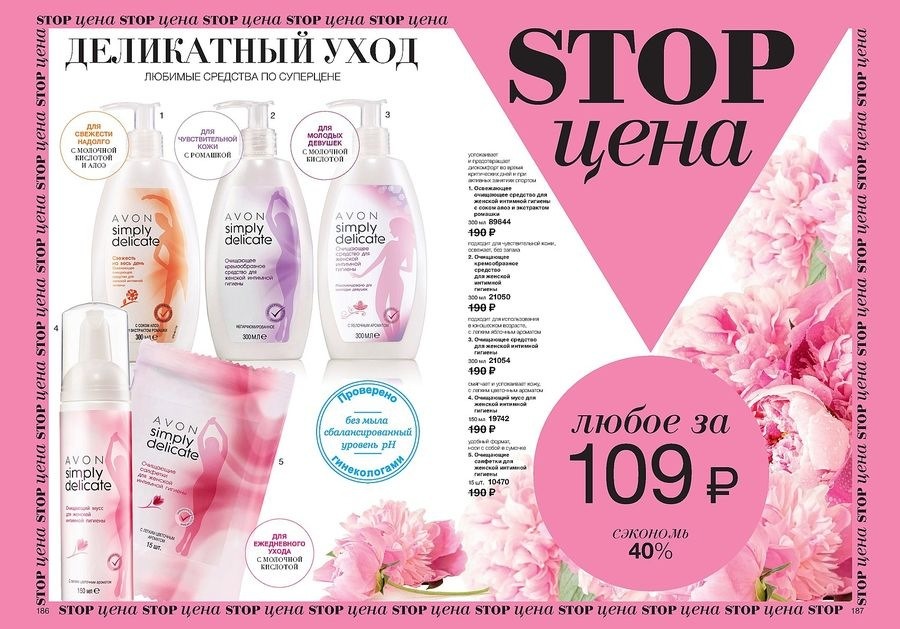 Одним из самых важных факторов женского здоровья является интимная гигиена. Средства Avon Simply Delicate поддерживают естественный баланс микрофлоры интимных зон, мягко очищают, не вызывая раздражения, успокаивают и освежают кожу. Все продукты протестированы на аллергенность и проверены гинекологами.